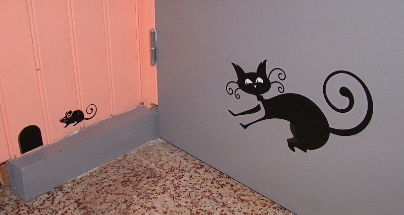 The kitchen walls were decorated with paintings of cats