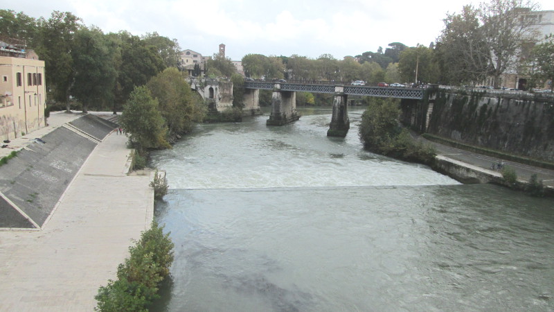 River Tiber. More accurately half of the River Tiber, on the left is an island mid-stream; this is looking SE from Ponte Cestio towards Ponte Palatino.