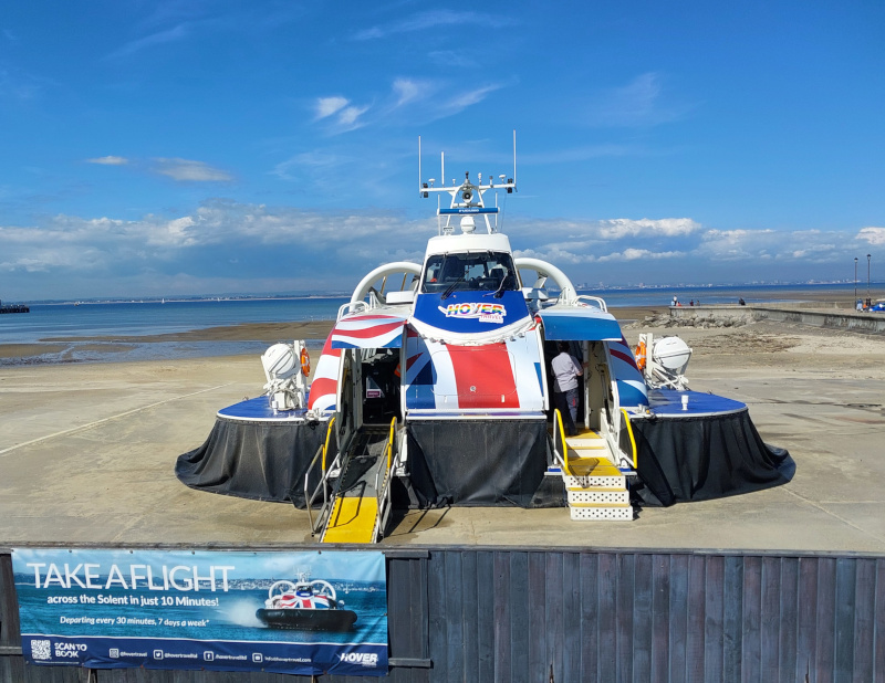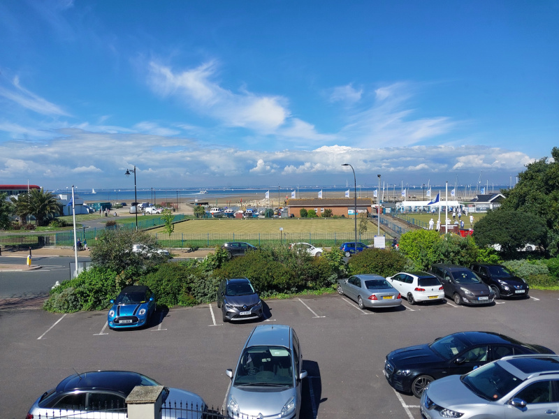 View from our hotel window: car park with Captur, Esplanade, bowling green, promenade, beach, Solent, Portsmouth. The 15:15 hovercraft sets off for Southsea.