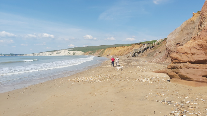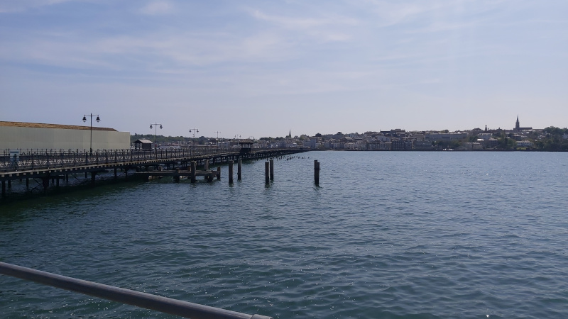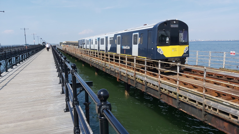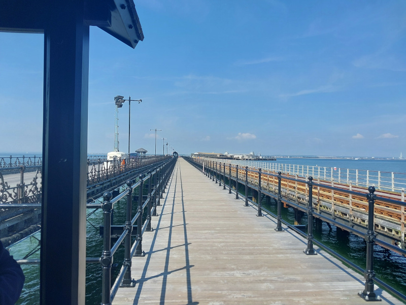 Ryde pier, from the brand-new pedestrian pier, with one of the new trains coming back from the Pier station.
