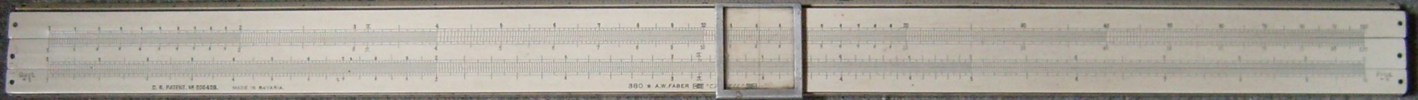 Faber Castell 380. Scale 500 mm. Wooden slide and stock with engraved plastic faces and brass pins. Double-sided slide with trig windows on the back. Metal cursor with a single line. Conversion factors and properties of materials on the back. Wood and canvas rigid case. Made in Bavaria. No scale values or names on the front, but has "Quot +1" at LH end of D and "Prod -1" at RH end to remind of index change. Inch and mm scales on stock. Stock is in two pieces with metal springs between. From the type of logo, this one probably dates from the early 1920s. Thanks to Mike for this one and the next one.