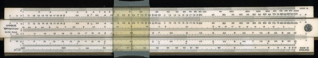 Unique "Brighton". Scale 254 mm. Wooden slide and stock. Stock halves joined by springy metal plate with printed formulae. Log-log on reverse of slide. Trig scales on separate scale on lower edge of lower stock, read using a special extra window on the cursor; cm scale at upper stock. Made in England. This one is a bit tired and barely useable