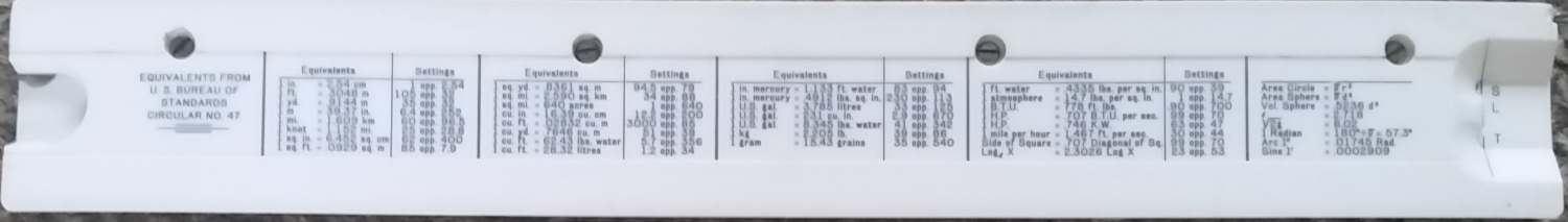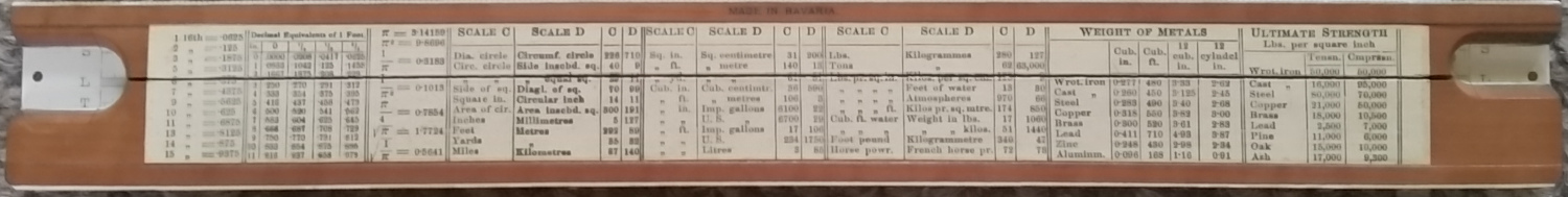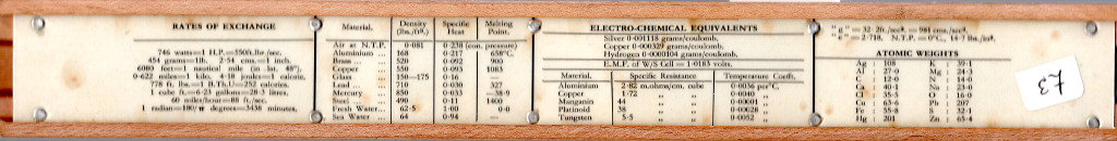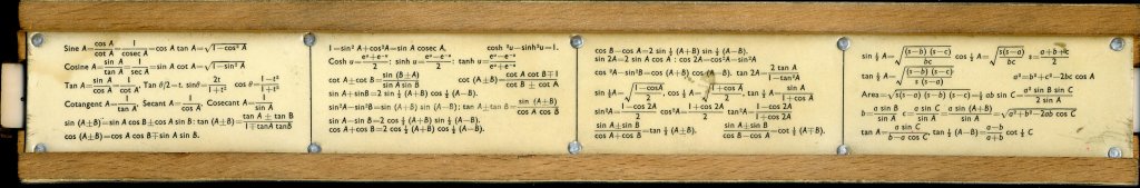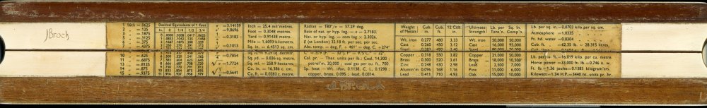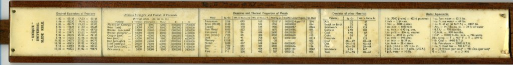 Unique Universal. Split wooden stock with metal spring, 254 mm scales printed under plastic laminate, pinned at ends. Cursor missing. Properties of materials and fractional conversions on the reverse. British. Probably 1930s or 1940s. Card slip case. No formulae; only S and T are named. Thanks to Glyn for this one.