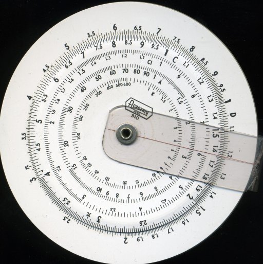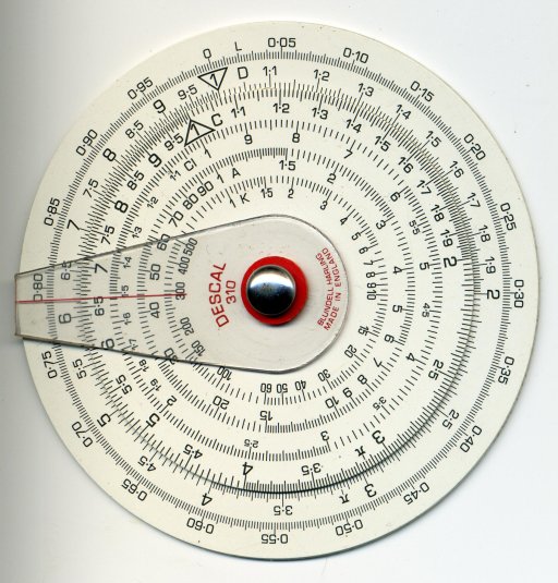 Blundell Descal 310 circular. Effective scale length about 180 mm for C and D scales. Two plastic disks and clear cursor, pivoted at centre. Cicular slide rules avoid the need to reverse the slide and are easier to carry for a given scale length (this one's about 75 mm diameter), but they're not so easy to manipulate. Thanks to Malcolm for this one.