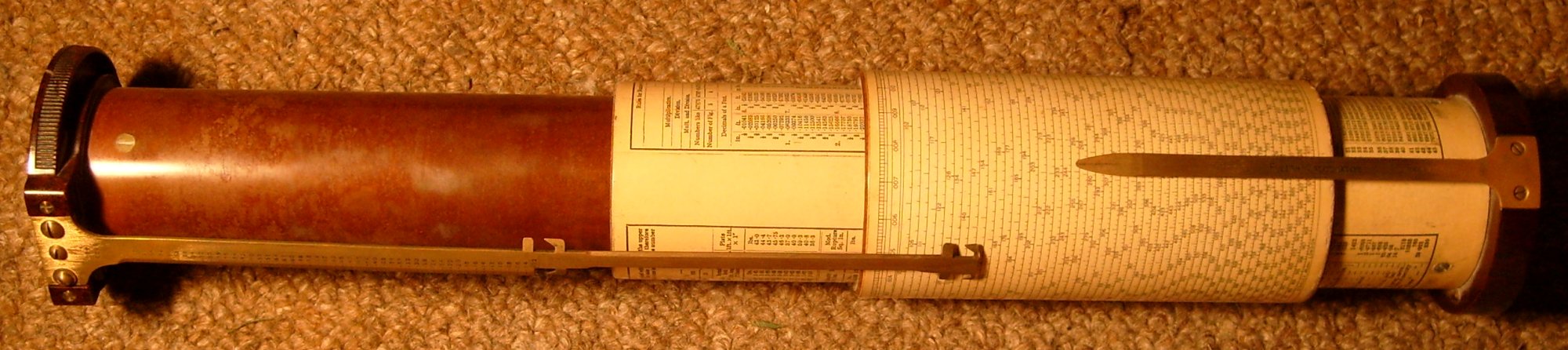 Fuller Calculator. This beauty is a helical slide rule with a scale length of around 13 metres. It has only the one scale, equivalent to a C, and effectively two linked cursors. Thanks to Joan for this one. Probably 1946.