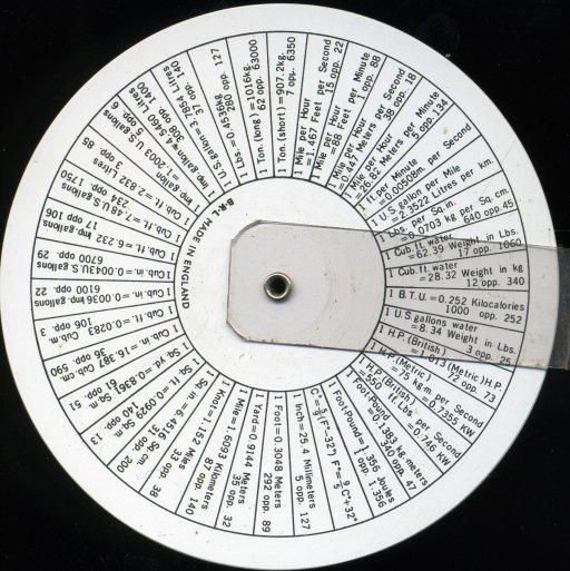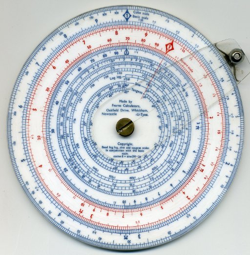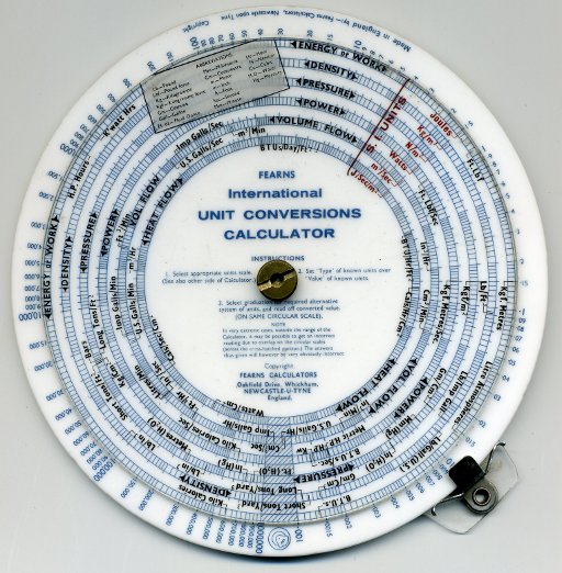 Fearns Calculator. A conventional circular slide rule from a prolific maker of specialist calculators. This one is unusual in having two full-size disks, with the front one clear and printed in red on the back surface; this allows the "slide" to have two edges, more like a conventional slide rule. The three-and-a-bit decade spiral log-log scale is also unusual, but very easy to use. This one was about to be thrown away when uncovered in a recent move at work. The rear has unit conversions for a small set of non-fundamental units. Effective scale length 330 mm.
