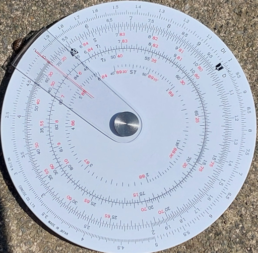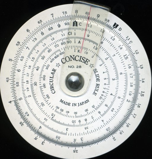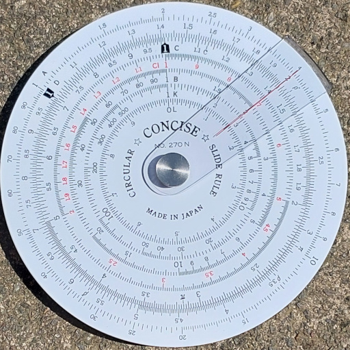 Concise 270N. A decent circular slide rule purchased recently (2025) from Japan in new state complete with instructions in Japanese only. Nice movement except that the front rotor is a little stiff over about a third of a rev and a bit too loose over the rest. The rear allows some trig calcs such as n*sin(x) and it's possible to cast from front to back via the cursor. Engraved and filled scales, crinkle spring tensioned pivot. Scale diameter at CD is 8 cm, giving a scale length of 25 cm so equivalent to a conventional 25 cm or "10-inch" rule.