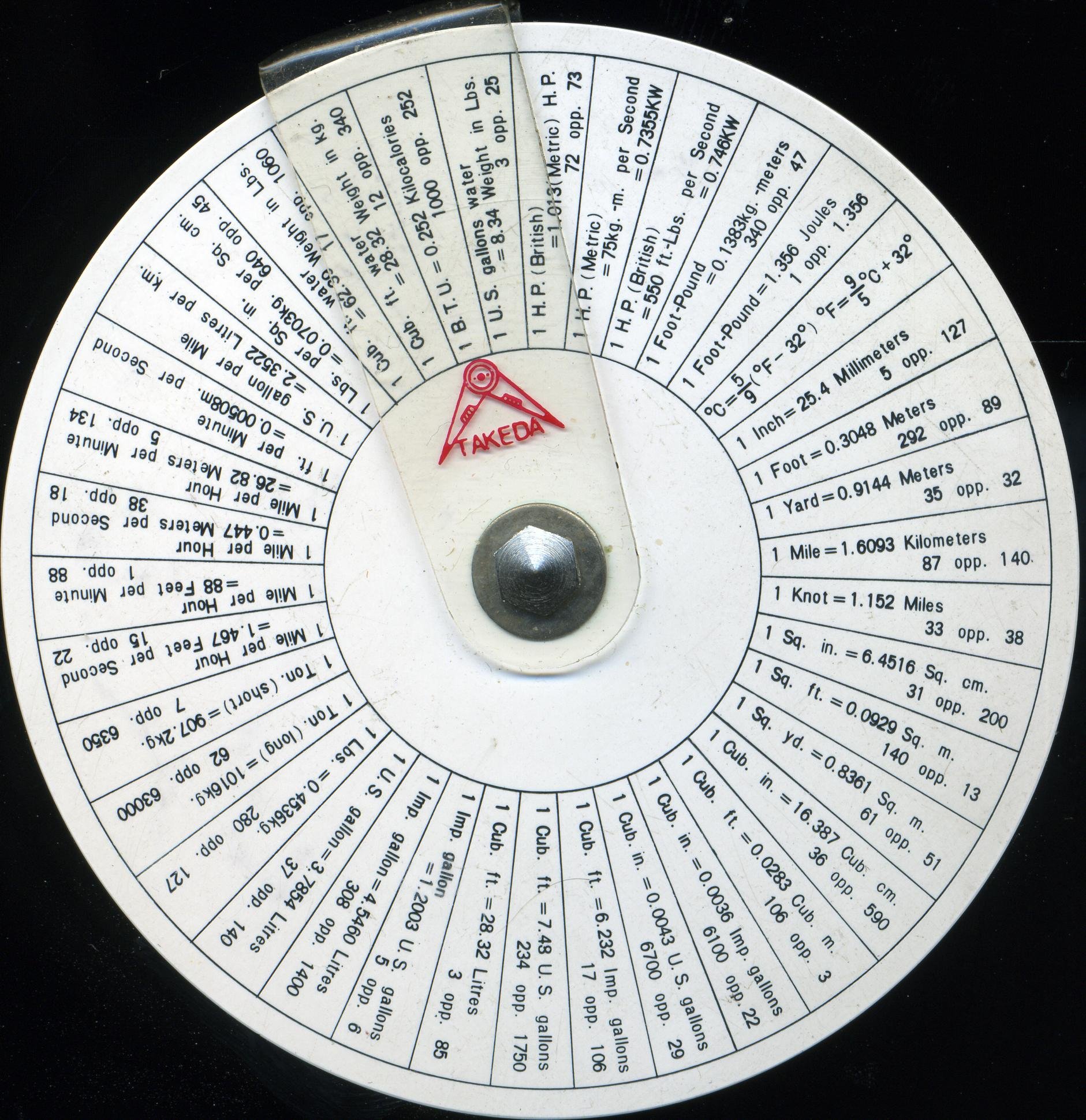 Academy 310 circular. Effective scale length about 180 mm for C and D scales. Two plastic disks and clear cursor, pivoted at centre. Possibly useful conversion factors on back
