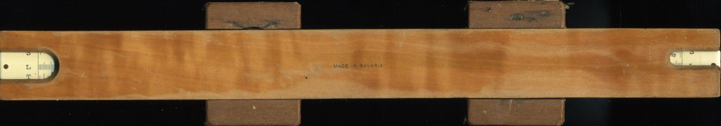 AW Faber 309. 250 mm scale. Wooden structure with white plastic facing pinned on. Single-sided with double-sided slide. Two cursors, wooden with plastic window. S, L and T scales can also be read from windows on the back. Scales on the front are unnamed. Made in Bavaria. From the presence of a model number and the solid wood construction, this one is probably from around 1910. Thanks to Emrys for this one.