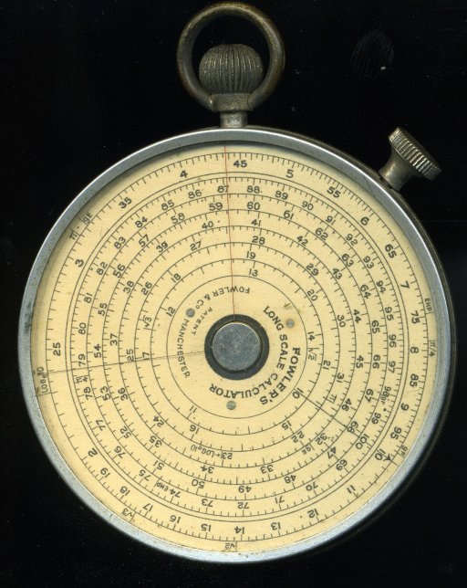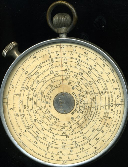 Fowler long scale calculator. Effective scale length for the short scale about 190 mm. Effective length for the 6-rev long-scale about 750 mm. A single-scale slide-rule with 2 pointers, in operation more like the Fuller rather than the other circular slide rules. Serial number 12435. Possibly 1930s, the combination of case style, scales and knob shape suggests ~1938 (from http://osgalleries.org/journal/pdf_files/7.2/v7.2p43.pdf). The serial number is sometimes a date code, which would give Friday 1935-04-12.