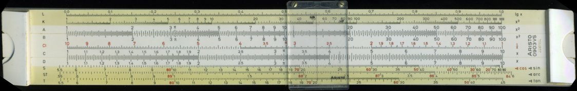 Aristo 0903 VS. 250 mm scale. Double-sided plastic, with bridge pieces on one side only. Wrap-around cursor, cursor lines for area of circle and x36. Upper and lower stock of different widths. Rigid plastic slip case. Made in Austria. Thanks to Dave (#2) for this one and the next one.