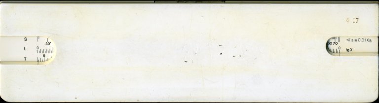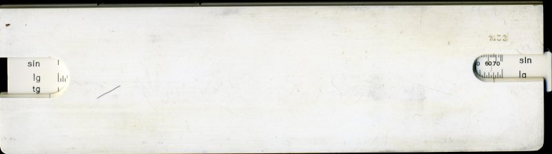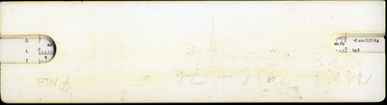 Thornton PIC No 121. 250 mm scale. Split wooden stock and wooden slide with plastic facings, pinned at ends. In addition to the conventional scales this one has some interesting idiosyncratic scales. Instead of the conventional sine scale for example, which is usually plotted as x = 0.1 * sin(T), this one plots x = 0.1 * T / sin(T) where T is in degrees. This makes the scales more compact, so that sine, tangent, arcsine and arctangent all fit into the space of one scale. There are also some extra short scales and pointers to the left of the rule which facilitate the setting up of interest rates using the log-log scales or simple percentages on the C and D scales. The metal cursor has a single rather fine line. Date might be 1949. Thanks to Dave (#3) for this one.