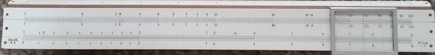 AW Faber 360. 250 mm scale. Wooden split stock with metal spring and plastic facing pinned on. Single-sided with double-sided slide. Metal and glass cursor with a single line. S, L and T scales can also be read from windows on the back. Scales on the front are unnamed. 10-inch ruler angled on top edge and 30 cm perpendicular on lower edge. 2-piece tubular card case. Interesting to see even on these very old Faber rules, which lack many of the features of later ones, the special scale marks C, C1 and M. C is at 1.128 = sqrt(4/pi), C1 is at 3.568 = sqrt(10)*C (both used in finding the area of a circle from its diameter), M is at 100/pi. Made in Bavaria. Probably between 1913 and 1920. Thanks to Clive for this one and the next one.