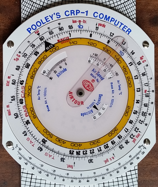 This is a special computer for pilots of small aircraft. There is a conventional circular slide rule, though the scales are marked unusually with C scaled 10 to 60 then 7 to 10 and D scaled 10 to 100; this is because the C (inner) scale is often used to read minutes, and its most prominent index mark is at 60. These scales are mainly used for simple ratio calculations such as converting miles to nautical miles, litres to US gallons, pounds fuel to gallons (using the specfic gravity offset sub-scales) or remaining fuel to remaining flight time. There are various marks to facilitate these conversions without having to remember the ratios. Several inset windows allow calculations of airspeed and altitude depending on temperature and true pressure.