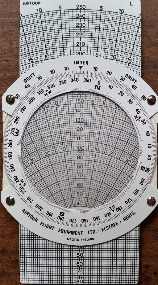 The reverse is a vector calculator. There is a vertical slide behind a rotating clear window. If the slide is set to ground speed, a pencil mark made offset by the wind speed and the screen then rotated to the wind direction, the vector sum, both magnitude and direction, can be read off. Similarly, groundspeed or wind velocity can be found from the other two.