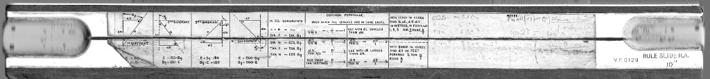 Royal Artillery VF0129. 250 mm scale. Split wooden stock with wooden spring. My father's from his time with the 9th Survey Reg. Very simple scales, unlabelled on front side. Lots of special marks, including some which appear to be hand-marked, presumably for some repetitive field calculations. Made I assume in the 1930s or early 1940s and well used, it has survived well except for a gap between slide and stock. Cardboard and leatherette case has not lasted so well. Manufacturer's logo looks like "PIC" which indicates it is an A G Thornton rule.