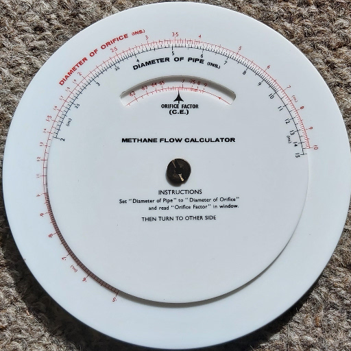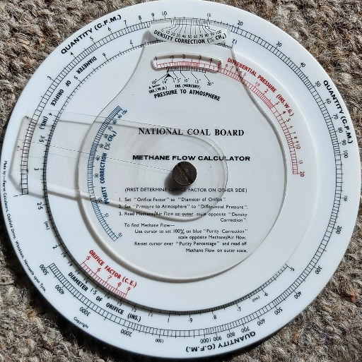 Methane Flow Calculator from the National Coal Board. Another one that Clive found, in Barnsley. This is a true slide rule, but set up to perform one calculation only and without any general-purpose scales. The instructions are printed on the face, and it calculates the flow rate of methane gas through an orifice in a pipe, in two stages. The first stage is done on the rear, and generates an orifice factor from the ratio of the diameters of the orifice and the pipe. The second stage on the front works out: