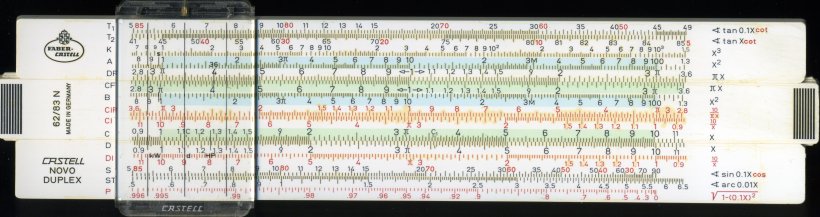Faber-Castell 62/83N Novo Duplex. 125 mm scale. Double-sided plastic with wrap-around two-piece plastic cursor. All scales have extensions. Cursor has area of circle, kW to HP (746W) and x36. Leather slip case. This and the next two Fabers have metal rod bearings for the cursor. Made in Germany. My favourite.