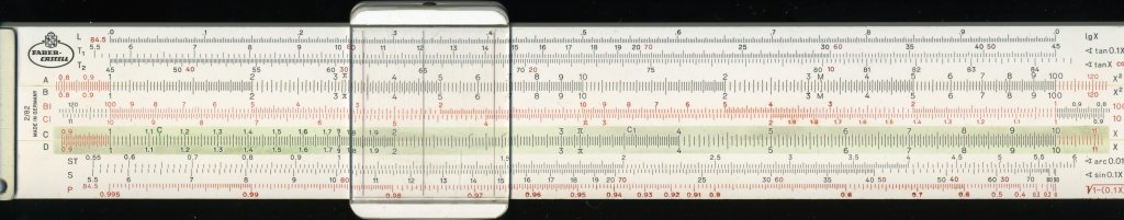 Faber-Castell 167/98 Log-Log. 125 mm scale. Single-sided one-piece plastic body, with windows on reverse to read S, L and T scales with double-sided slide in normal position. Single-piece plastic cursor with area of circle and (746W) HP to kW. 5-inch scale along ruler-edge at top. Leather slip case. Made in Germany. I bought this one new and carried it always, until Joan sat on it in 1981 and cracked it. It still works.