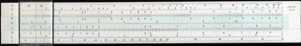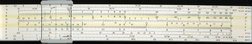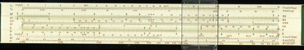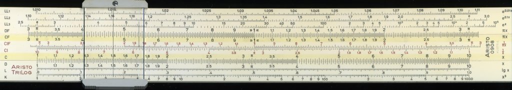 Aristo 0908 Trilog. 251 mm scale. Double-sided plastic, with bridge pieces on one side only. Wrap-around cursor with separate windows. Cursor lines for area of circle and x36. Upper and lower stock of different widths. Rigid plastic slip case. Made in Austria. Thanks to Dave (#1) for this one and the Jakar.